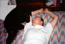 5am to 7am he laid out front in grass with Elnora siting by him. He thru up white foamy stuff a couple of times. Probably a good part of his congestion. Later that afternoon he thru up more white stuff. He’s still walking but weaker, and following his normal routine of being my loyal pal right by my side. Up, on the bed (with a boost from mom). His face and eyes look more happy and normal for him. We cuddle as usual before I get up. For breakfast Mom makes him chicken broth and squirts an ounce or so in by syringe. This afternoon he gets more chicken broth by syringe. This evening Elnora follows Dr. Falconer’s (the second D.V.M.) advice to feed him raw chicken or beef. Elnora blends up a batch of liquid food containing some raw chicken liver along with, parsley, yogurt, & brewers yeast. I go to bed, and Midnight uncharacteristically, lays in the front hallway.