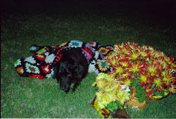 - 11:30 pm, I take blankets and go out to Midnight in the backyard. The ground isn’t wet with dew yet, but it’s a chilly clear night with lots of stars. I pull Midnight onto a blanket and give him a pillow to rest his head on. I tell him we are going to camp out tonight. He seems comfortable, but isn’t sleeping much, just dozing off.