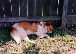 December 4, 2006 Monday evening while we watched TV, Penny slept the whole evening on the carpet in the living room without customarily moving over to the tile floor. At dinner time earlier, she was reluctant to eat, (which was odd), but she did. When she attempted to get up, she couldn’t and when helped up, her legs were trembling and very unsteady. Her eyes were rapidly moving back and forth like she was speed reading continually. I called the emergency vet office in Round Rock, they said it could be anything from vestibular syndrome to a brain tumor. Elnora gave her half of a pain pill left over from Midnight’s prescription. About 12 midnight, Elnora slid her outside and held her up to pee before we all went to bed. Penny also thru up her supper before coming in for bed.
